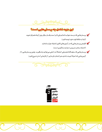 محتوای کتاب مجموعه سؤالاتی است که مطالعه و تمرین روی آن ها برای شما -و فقط برای خود شما- مهم ترین است. این سؤالات برای دوست شما، هم کلاسی شما، و حتی دانش آموزان هم تراز شما کاملاً متفاوت است.